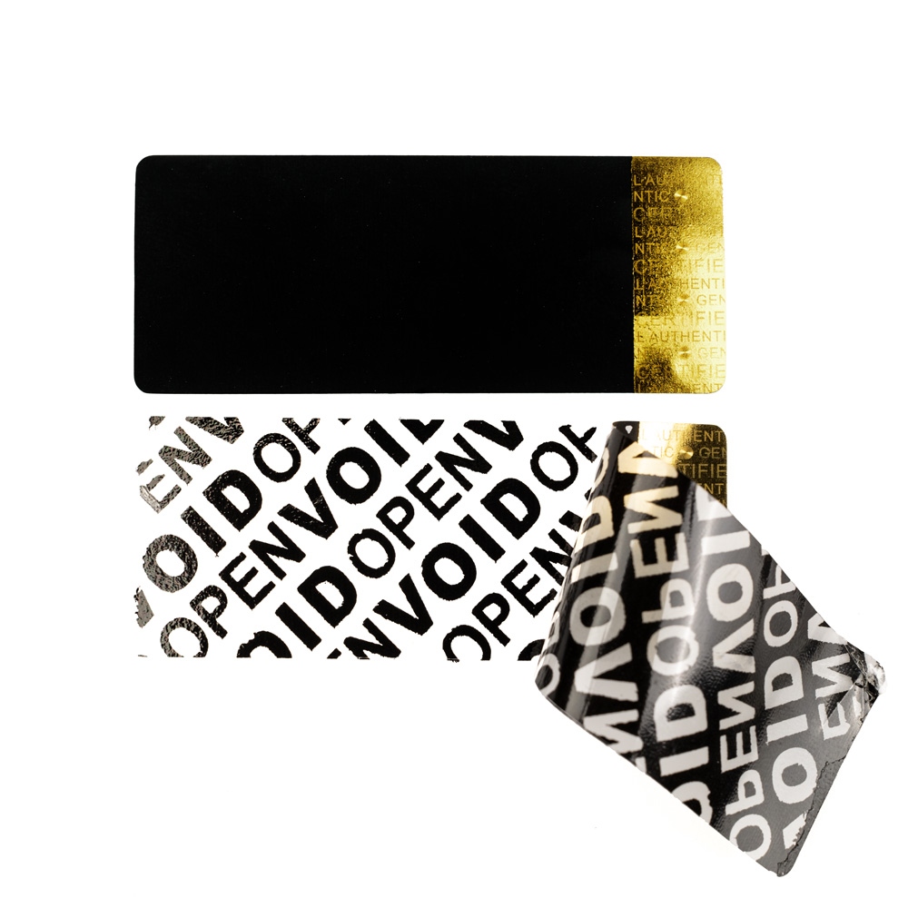 Hoch elegante schwarze residuelle Siegelkennzeichen mit VOID Unterlage und mit einem goldenen Masterhologramm auf dem Rande, bestimmt für den Aufdruck in Thermotransferdruckern des Typs ZEBRA oder POSTEK für den Druck der Seriennummern, Herstellungsnummern, Strichkoden, QR Koden, Lizenzen, Herstellerlogos oder Warranty Void If Open und anderen Garantietexten, zum Versiegeln von Kisten, Verpackungen, türen oder andere Applikationen. ... Mehr